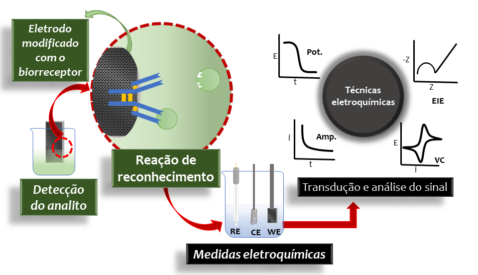 A linha de pesquisa em sensores e biossensores busca o desenvolvimento de dispositivos que possam realizar monitoramento sensÃvel e seletivo de moléculas e biomoléculas na área medicinal, ambiental, alimentÃcia, industrial, entre outras. Os sensores quÃmicos possuem duas unidades fundamentais para seu funcionamento: o receptor e o transdutor. O receptor é o responsável por transformar uma informação quÃmica em uma forma de energia que poderá ser lida pelo transdutor, que então fará com que essa energia possa ser transformada em um sinal analÃtico útil. A forma de transdução do sinal pode ser óptica, eletroquÃmica, elétrica, termoelétrica, sensÃvel a massa ou radiação. Com base no receptor, os sensores apresentam três classificações: fÃsico, quÃmico ou bioquÃmico. Sensores bioquÃmicos são também conhecidos como biossensores, e são considerados uma classe de sensor quÃmico, mas com o diferencial de que uma molécula biológica (biorreceptor) efetua a função de receptor de um sinal biológico.​